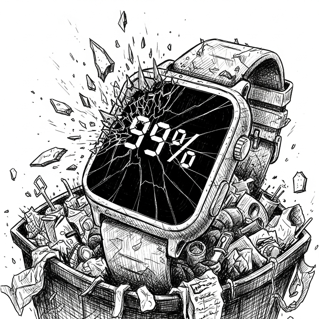 「歩数は腕を振るだけでカウントされ、血圧や心拍数は机の上に置いても計測される乱数表示おもちゃである。」