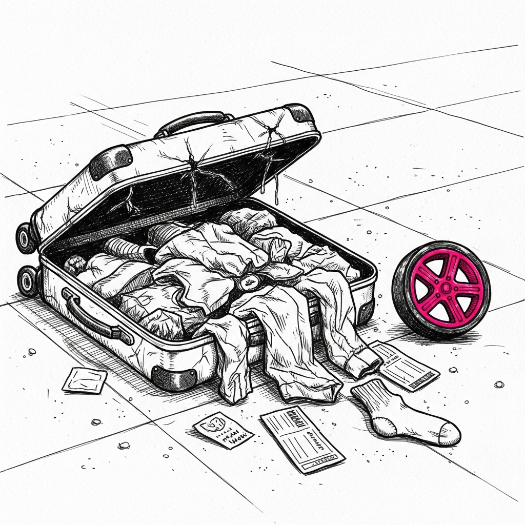 壊れたスーツケースを引きずりながら友人たちに遅れを取る姿は、青春のほろ苦い思い出…ではなく、単なる「準備不足の悲劇」です。